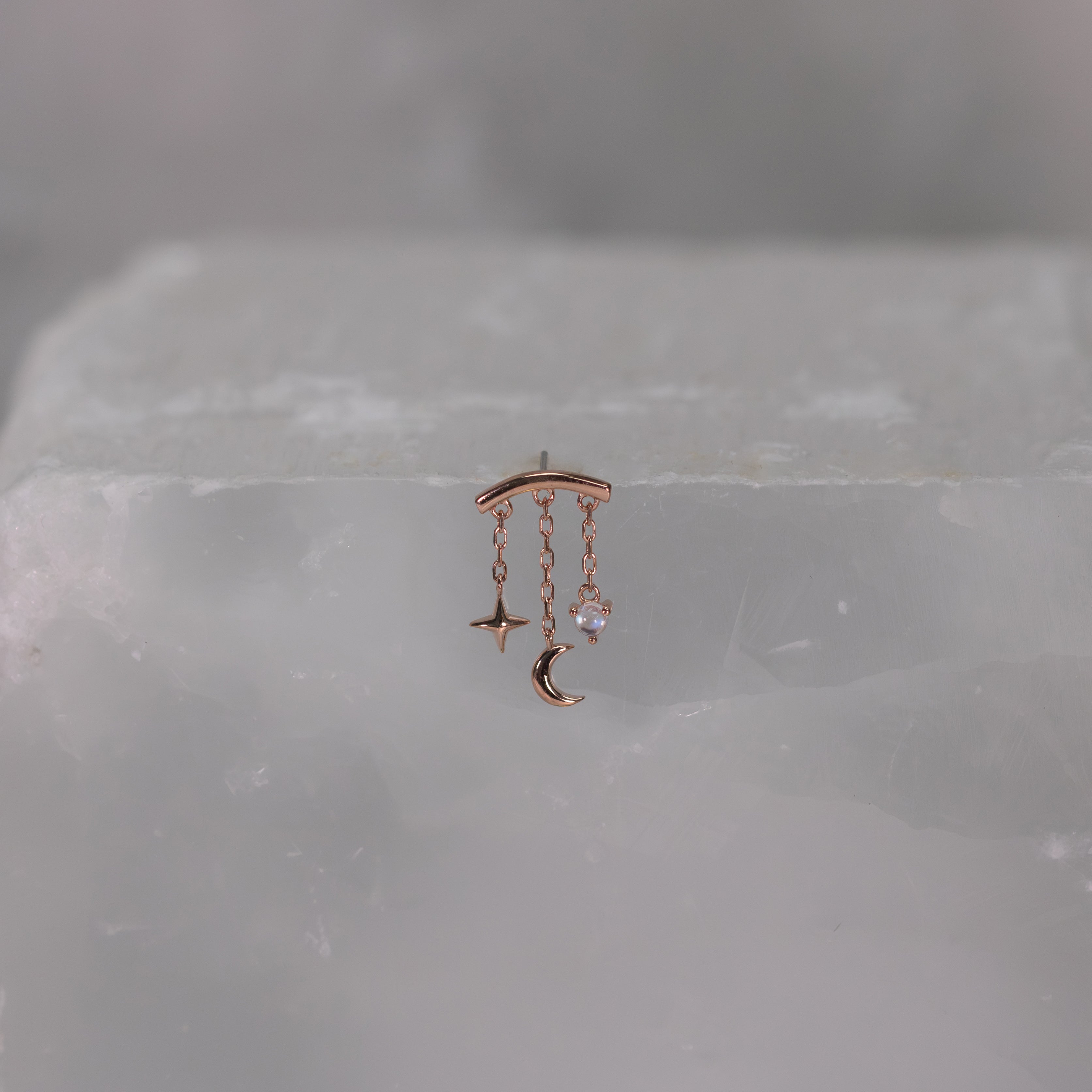 A star, a moon and a tiny genuine stone. This piece is designed to be worn in a "hidden helix" style of piercing but you can alway get creative with placement!