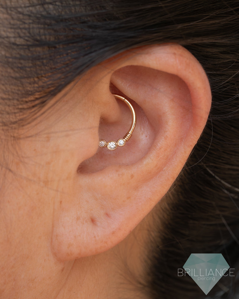 Dainty hinged ring with three tiny Swarovski CZs and a faux wire wrapping detail. Looks exceptional in septum and daith piercings!