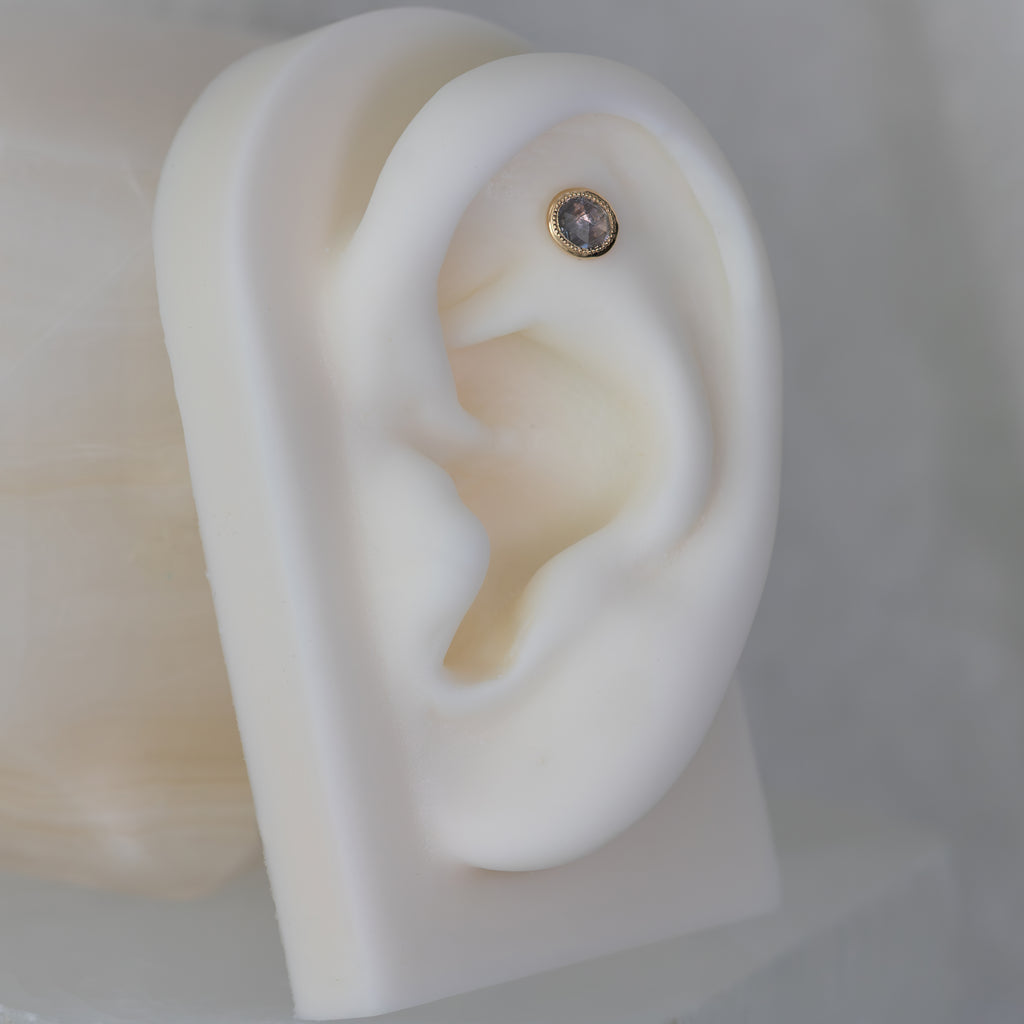 A baby blue genuine stone bezel set into a setting with millgrain details. Would look amazing in a conch, helix or philtrum piercing!