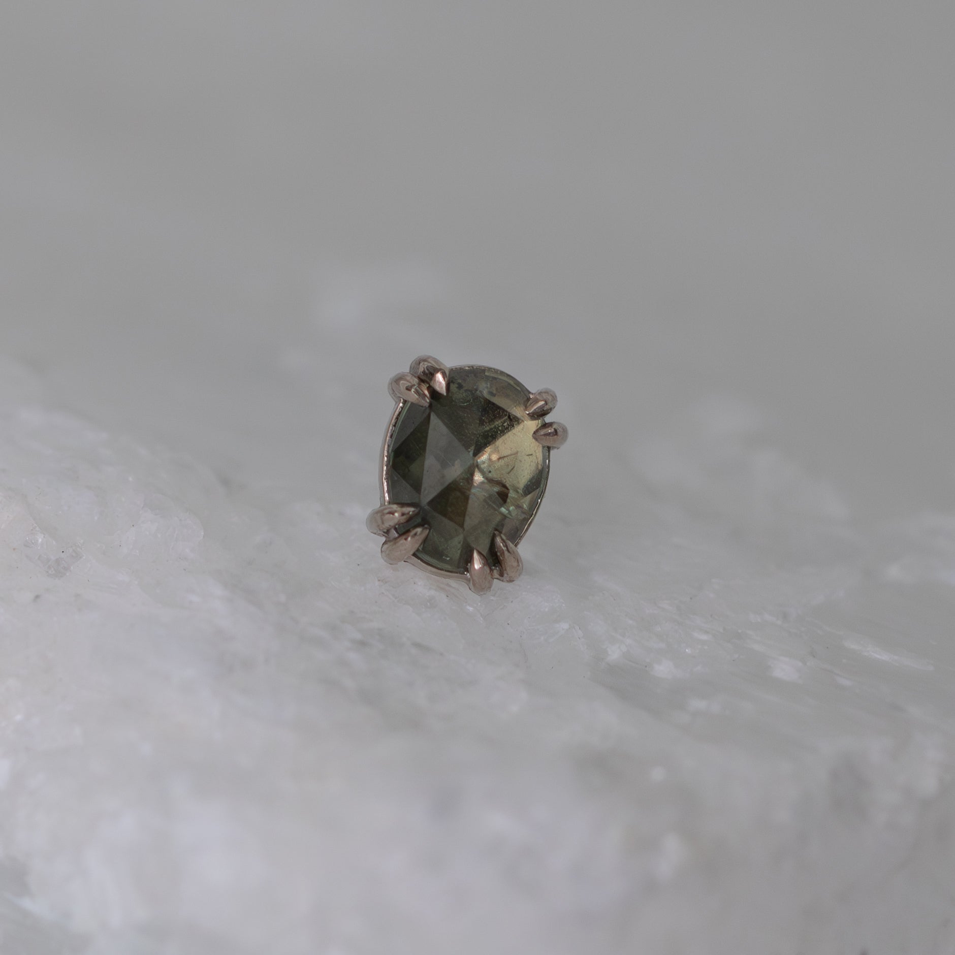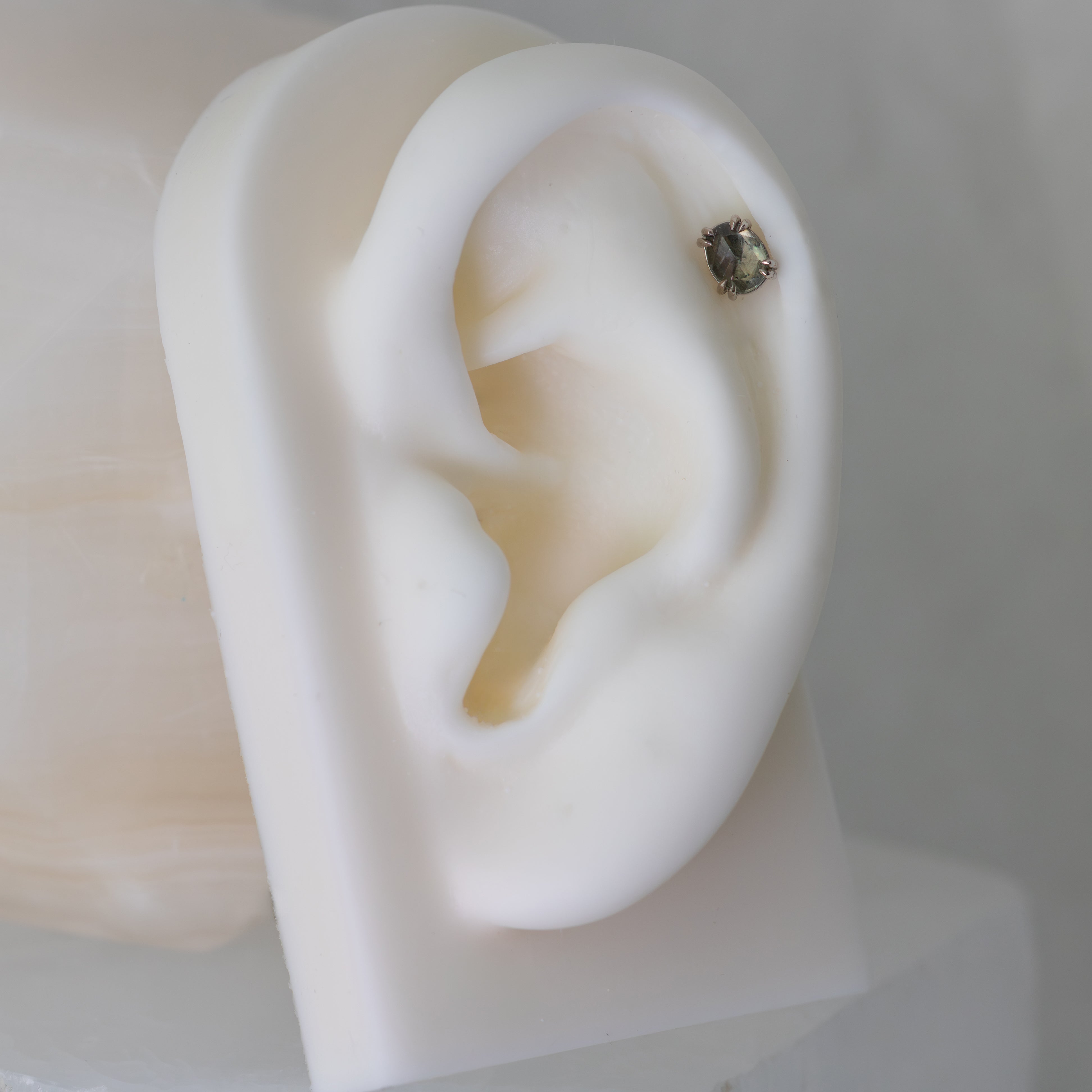 A green rose cut genuine sapphire in a unique claw prong setting. Gives a natural and elegant feel to a variety of piercings. Would look great in a conch, helix or more!