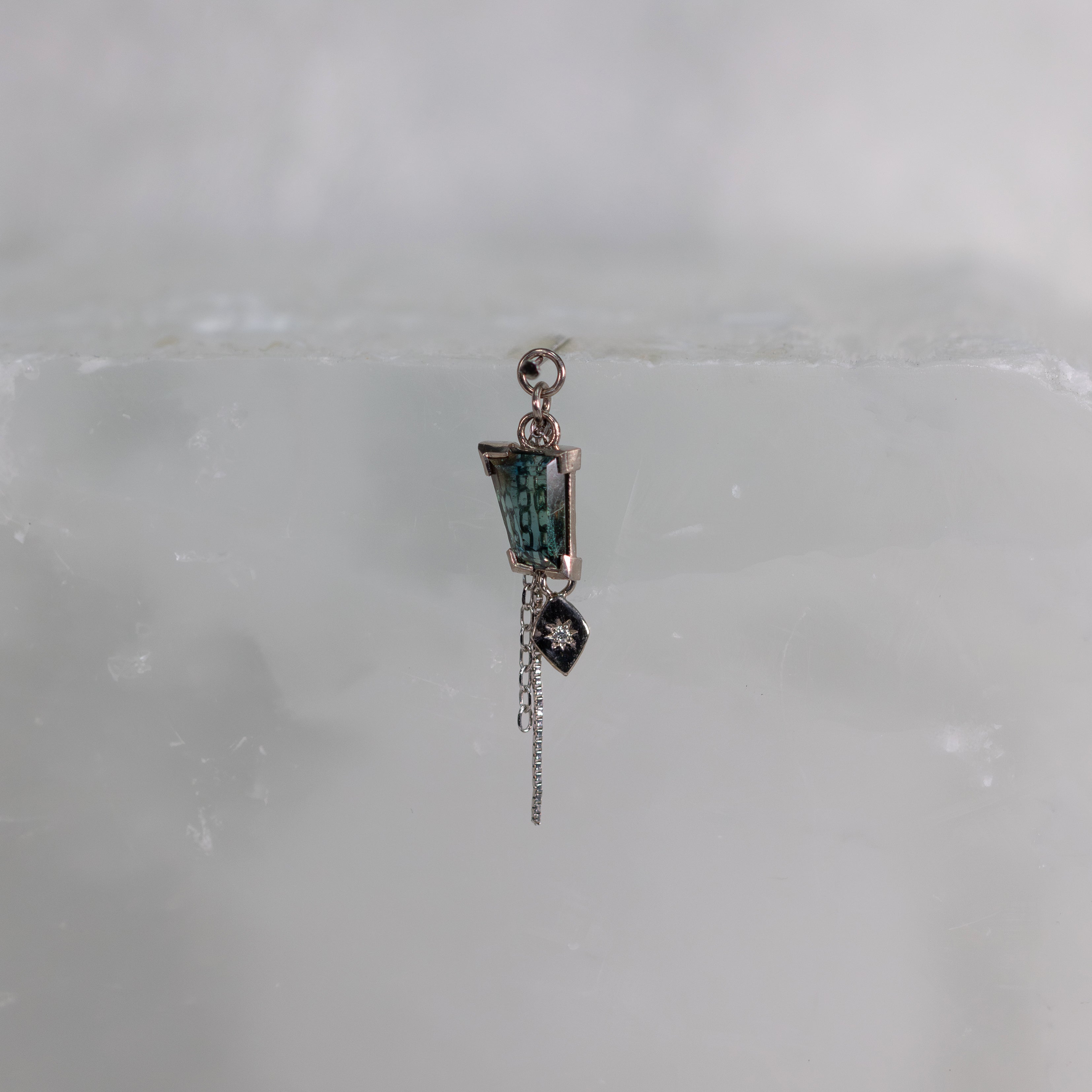 A geometric cut stone in a partial bezel accented by chains and a tiny diamond sparkle.